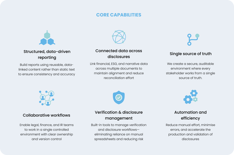 The platform replaces manual, document-based workflows with a controlled, data-driven approach, allowing teams to connect financial and non-financial information across disclosures. This ensures consistency, traceability, and auditability throughout the reporting and transaction lifecycle.